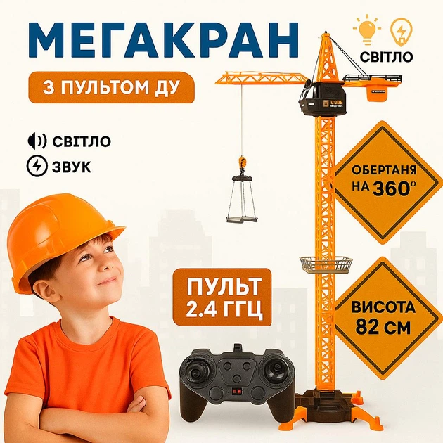 Іграшковий підйомний кран на радіокеруванні з пультом, 82см, 360° обертання, світло, звук, акумулятор, дитячий будівельний к