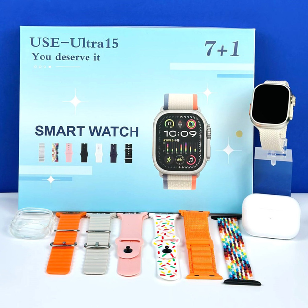 Набір смарт годинник Smart Watch USE-Ultra 15 з 7-ма ремінцями та безпровідними навушниками Мокко