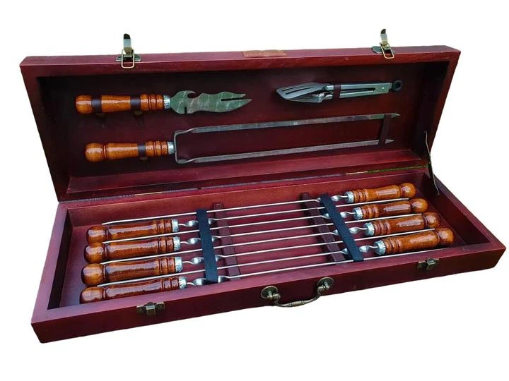 Набір із 6 шампурів "Вінінг" з кованою ручкою (700х12х3 мм) у дерев'яному кейсі + набір аксесуарів Ш21