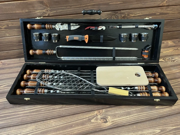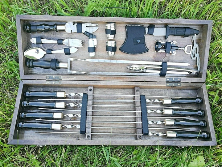 Набір шампурів у дерев'яному кейсі Bbq Lux 75x24x10 см нержавіючої сталі 31 предмет (80-10-KS-7807)