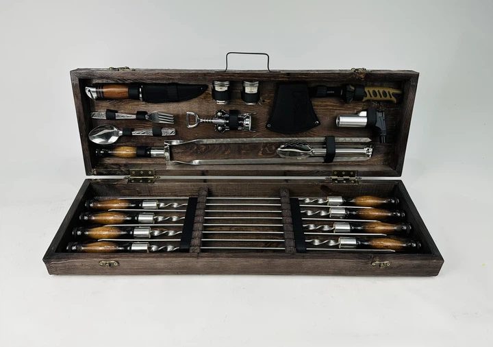 Подарунковий набір шампурів і аксесуарів Максі із нержавіючої сталі 38 в 1 в дерев'яному кейсі (4-10-KS-7605)