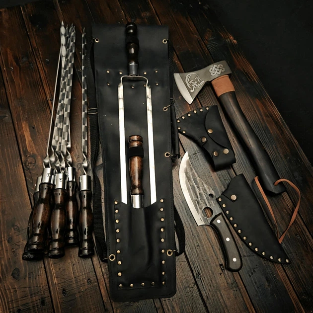 Набір із 6 шампурів з кованою ручкою "Вікінг" (700х12х3 мм) + подвійний шампур + комплект, в дерев'яному кейсі