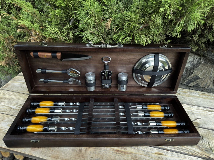 Набір шампурів для барбекю подарунковий з нержавіючої сталі у дерев’яному кейсі Гранд градієнт