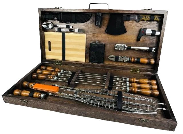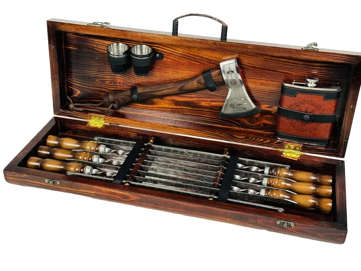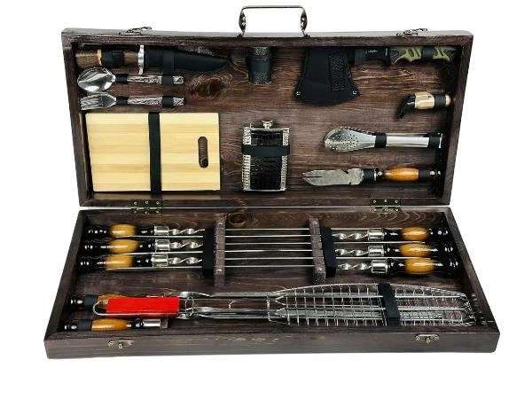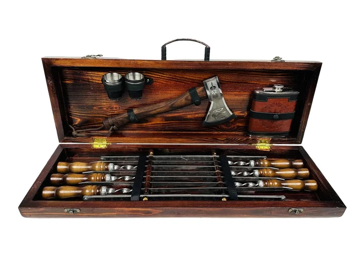 Подарунковий набір у дерев'яному кейсі MAX для пікніка ручної роботи шампура та аксесуари з нержавіюча сталь (80-10-KS-7502)