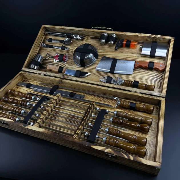 Набір із 8 шампурів "Люкс" (630х12х3 мм) у буковому кейсі + набір аксесуарів Ш71