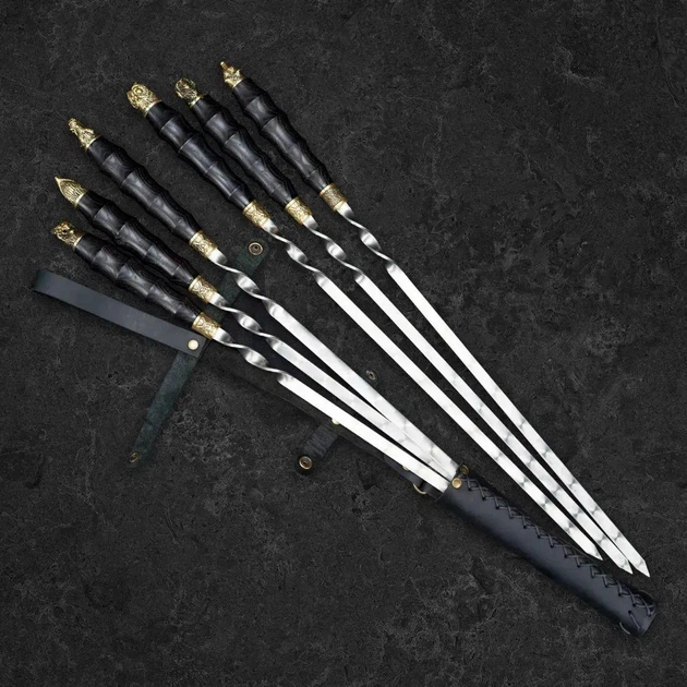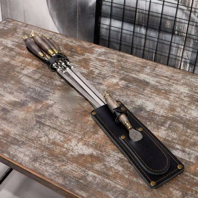 Набір шампурів ручної роботи 6 шт у шкіряному чохлі, великий подарунковий набір шампурів 6 предметів NKH-09