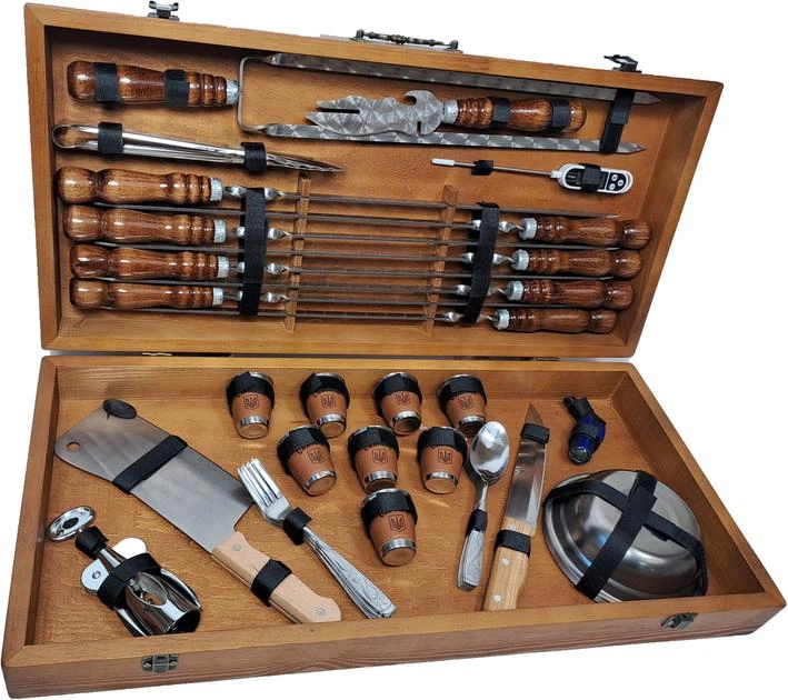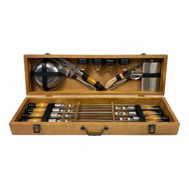 Набір шампурів та аксесуарів Мілітарі Metalzavod у дерев'яному кейсі з нержавіючої сталі на 14 предметів