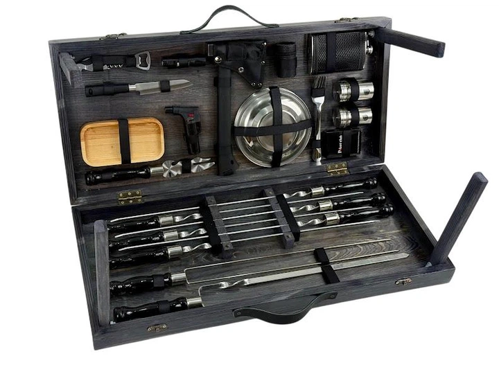Набір шампурів Богатир великий з нержавіючої сталі у дерев'яному кейсі 37 предметів Чорний (14-10-KS-7514)