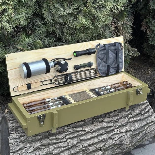 Набір шампурів у дерев'яному кейсі Metalzavod Штурм із нержавіючої сталі на 12 предметів Олива