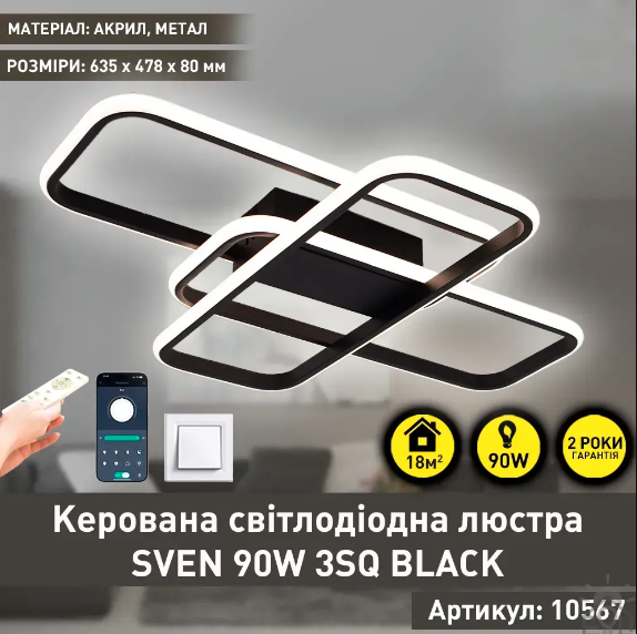 Керована світлодіодна люстра Esllse SVEN 3SQ 90W 635x478x75мм чорна