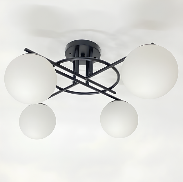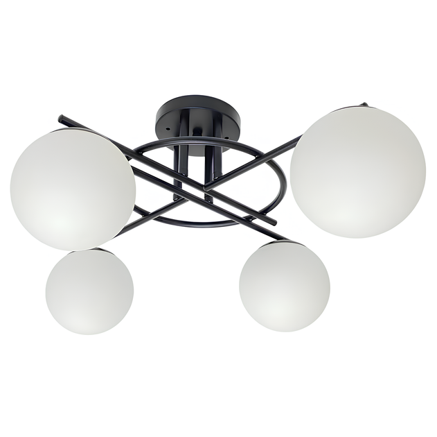 Стельова люстра VALESO 91182/4 з 4 білими скляними кулями під лампи E27 на чорному корпусі.