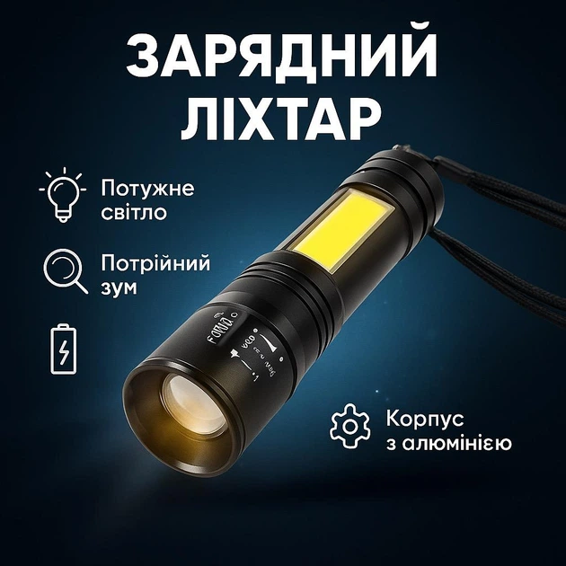 Ручний акумуляторний ліхтарик Power Style MX-829-COB з боковим діодом, 4 режими, USB заряджання, алюмінієвий корпус