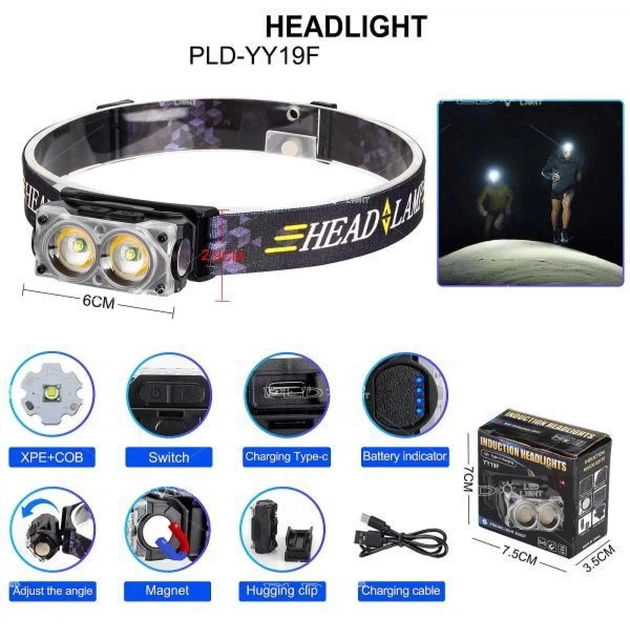 Фонарь налобный с датчиком движения CY-2089 (XPE+COB+RGB, IPX4, 6 режимов, USB)