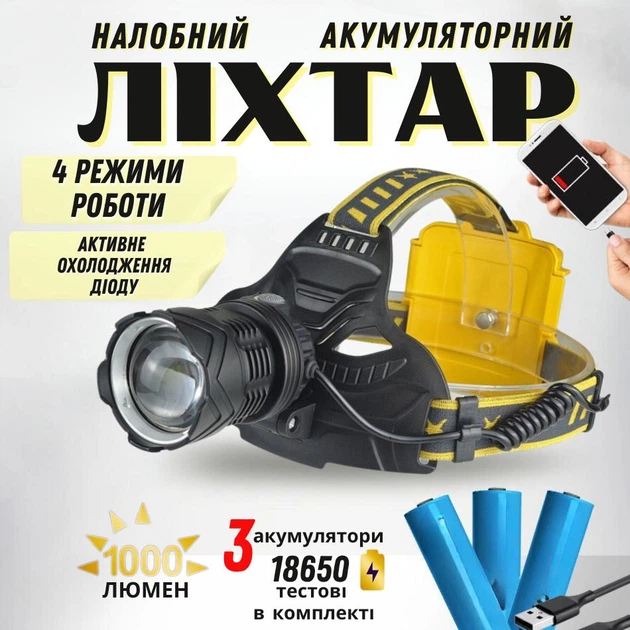 Фонарь налобный аккумуляторный 18650 х 3 фонарик на голову з потужним діодом і охолодженняv діоду для роботи вдома і відпочи