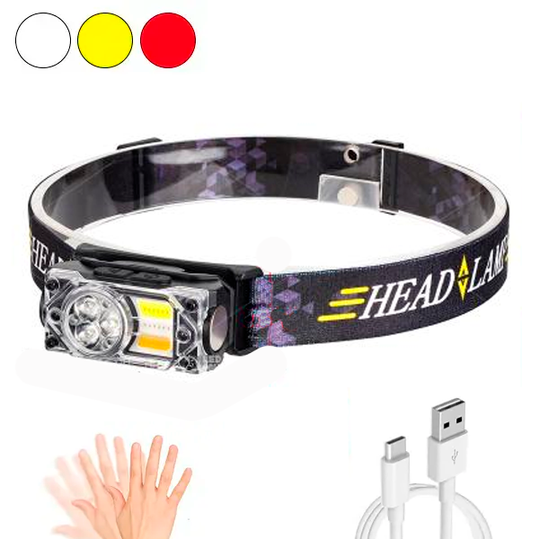 Налобный фонарь YY-19B, 3SMD+2COB, красный, желтый, белый, датчик движения, АКБ Li-Ion, магнит, ЗУ Type-C