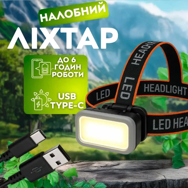 Ліхтар налобний 2в1 з ручкою COB нахил 180+180, магніт, USB-C