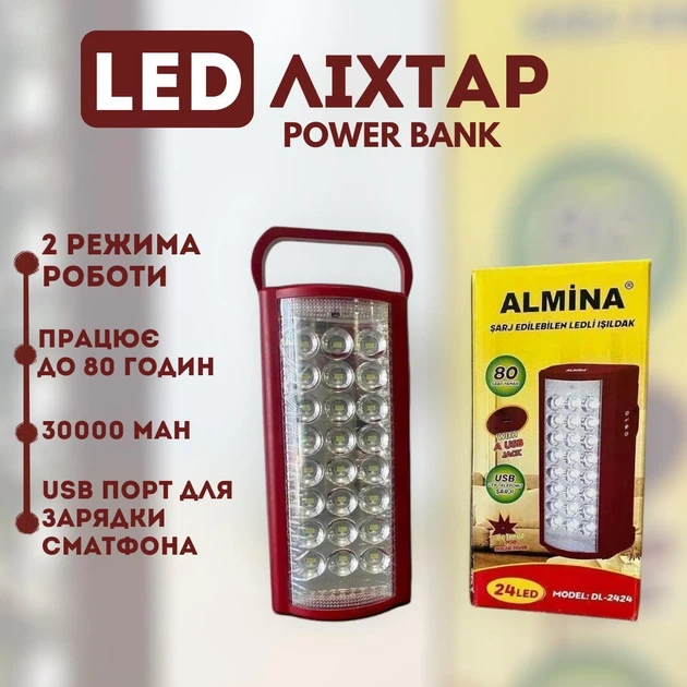 Ліхтар акумуляторний світлодіодний із повербанком ALMINA 24 LED