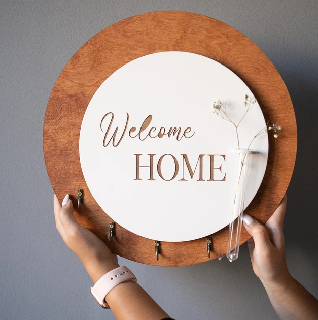 Настінний декор у стилі мінімалізм. Дерев'яне панно Decart на кухню, вітальню або спальню Ключниця з дерева Welcome home 35х
