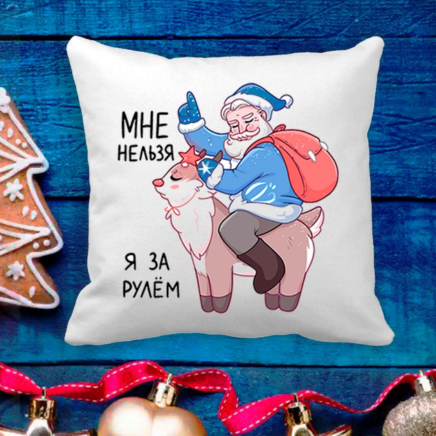 Подушка з новорічним принтом Дід Мороз на олені "Мені не можна, я за кермом"