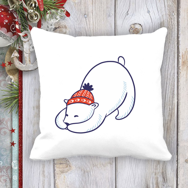 Подушка з новорічним принтом Білий ведмідь у шапці