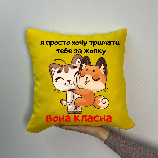Подушка з принтом габардинова Я просто хочу тримати тобі за дупу, жовта 35х35 (1033)