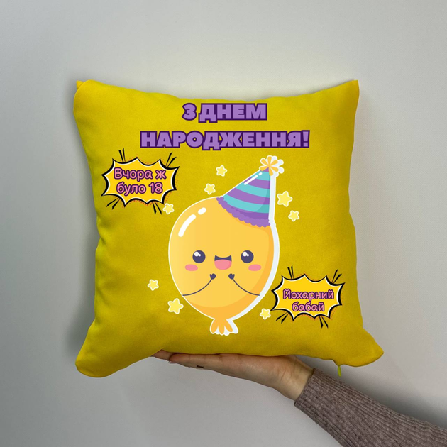 Подушка з принтом габардинова З днем народження, жовта 35х35 (939)
