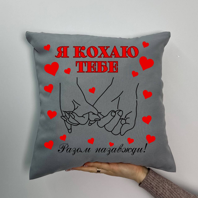 Подушка с принтом габардинова Я тобі люблю, Разом назавжди!, сіра 35х35 (1356)