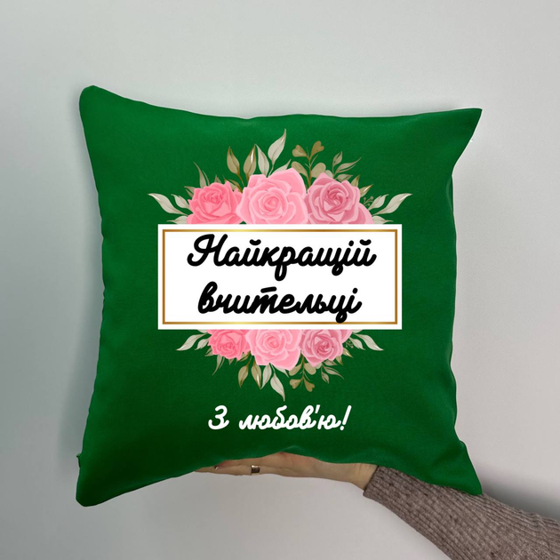 Подушка с принтом габардинова Кращі вчительці з любов'ю, зелена 35х35 (1078)