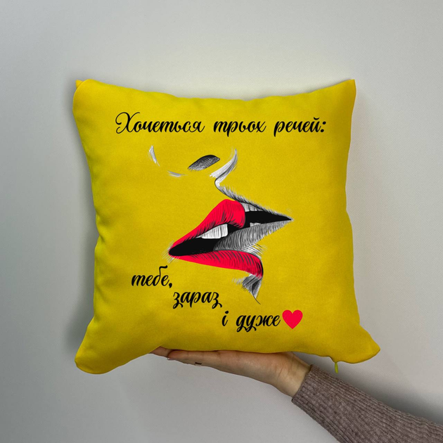 Подушка з принтом габардинова Хочеться трьох промов, жовта 35х35 (1769)