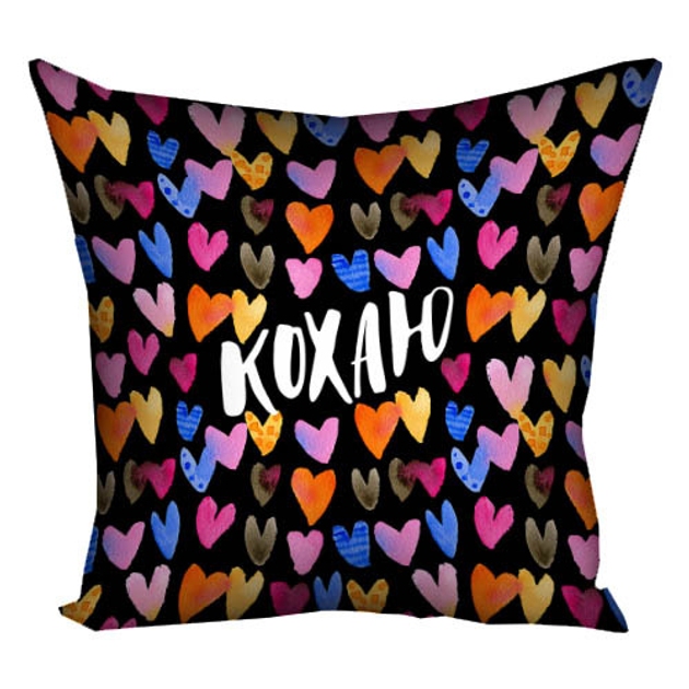 Подушка з принтом габардинова Кохаю на черном фоне с разноцветными сердечками 50x50 см