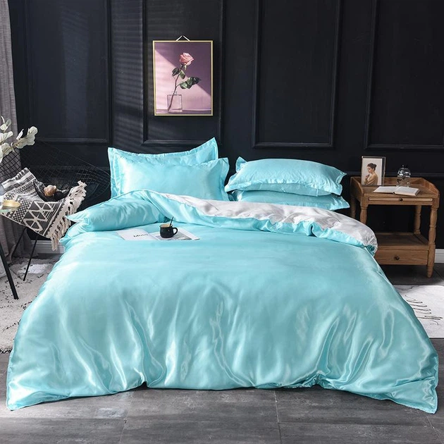 Атласний набір білизни Напівторний 145х210 з простирадлом на гумці наволочка 2х50х70 Блакитний (Р7-fabric-at-025-1)