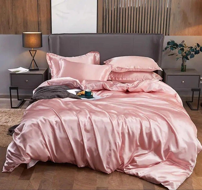 Атласний набір білизни Напівторний 145х210 з простирадлом на гумці наволочка 2х70х70 Рожевий (Р7-fabric-at-017-1)