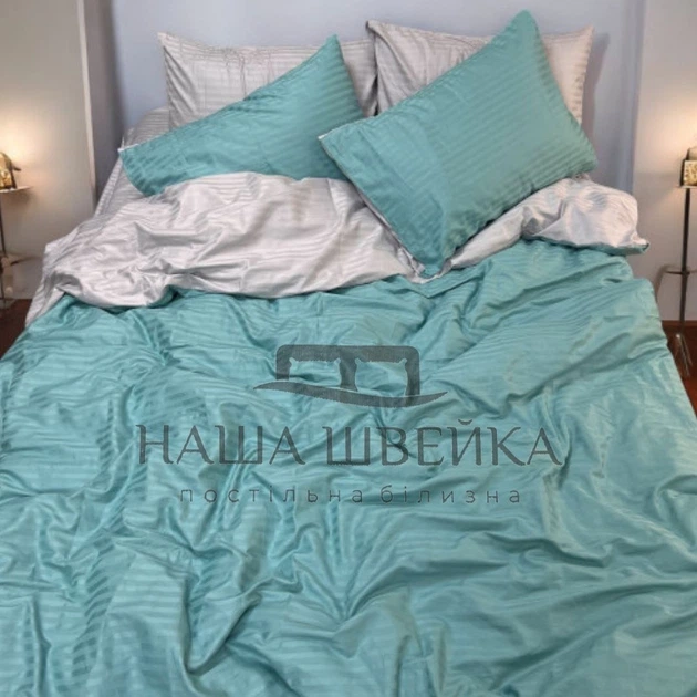 Комплект постільної білизни Наша Швейка Сатин страйп Аквамарин і світлий однотонний сірий Полуторний 150х215 см