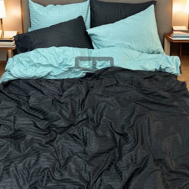 Комплект постільної білизни Наша Швейка Сатин страйп Чорний графіт та аквамарин однотонний Полуторний 150х215 см