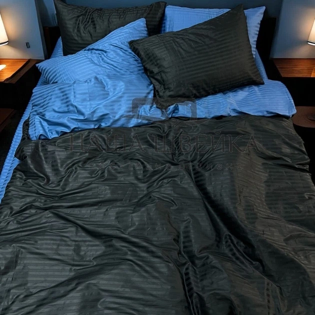Комплект постільної білизни Наша Швейка Сатин страйп Чорний графіт та яскраво синій однотонний Полуторний 150х215 см