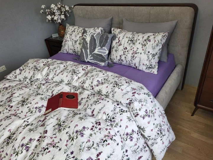 Постільна білизна з резинкою Лавандовий подих DUO, ранфорс гофра (жатка) Полуторний розмір, наволочки 70/70