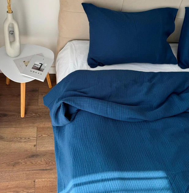 Комплект з преміального 4-х шарового мусліну LavSon Двоспальний 180х220 Синій простирадло ранфорс 220х230 Білий
