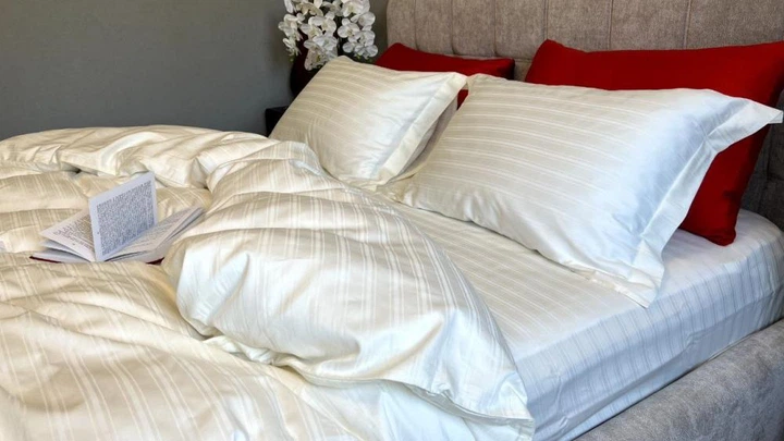 Постільна білизна Мульти страйп сатин молочний, PREMIUM Евро розмір, наволочки 50/70