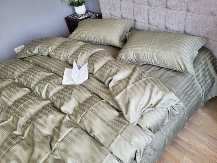 Постільна білизна з резинкою Мульти страйп сатин олива, PREMIUM Евро розмір, наволочки 50/70