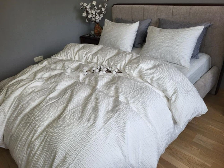 Постільна білизна з гумкою біла, сімейний розмір 145х215см х2шт, жатка, турецький сатин преміум гофре, наволочки 50х70, 100