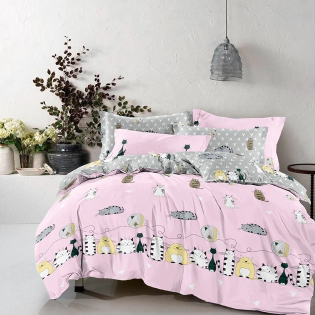 Комплект постільної білизни Королева Ночі Бязь 175х215 Двоспальний Коти на розовому та сірому 1092-2