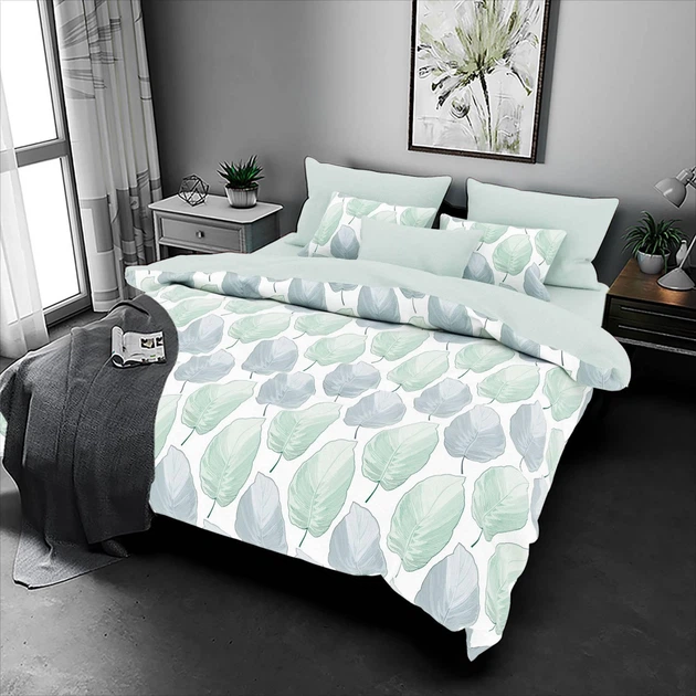 Комплект постільної білизни Королева Ночі Бязь 175х215 Двоспальний Листя на білому та бірюзовому 0124-2