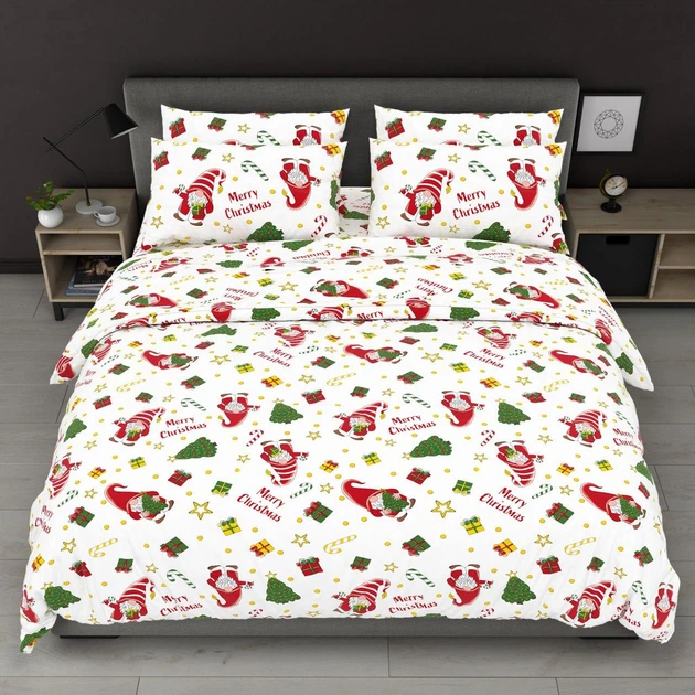 Комплект постільної білизни Королева Ночі Бязь 175х215 Двоспальний Різдвяні гноми та ялинки на білому 0449-2