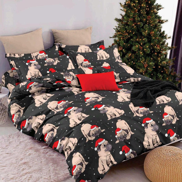 Комплект постільної білизни Королева Ночі Бязь 145х215 Полуторний Новорічні мопси на чорному 0227-1