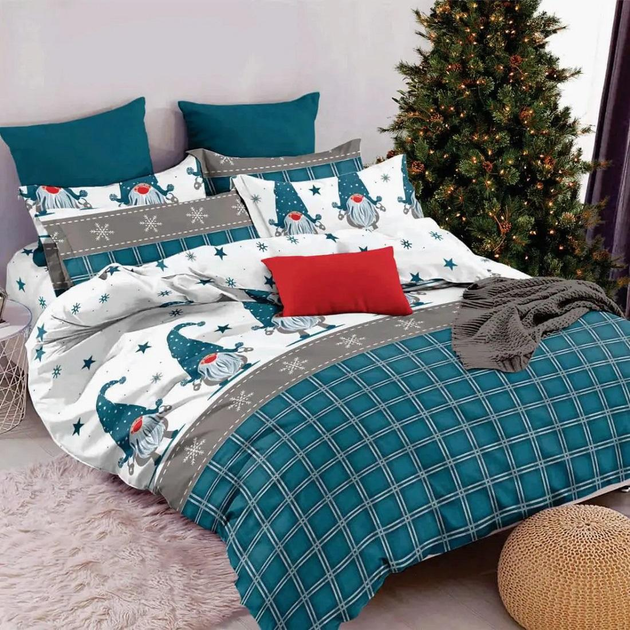 Новорічна постільне белье Гноми на бірюзовому NoviTeks Бязь Gold 1-5 спальний 150х220 см (АН29-2)