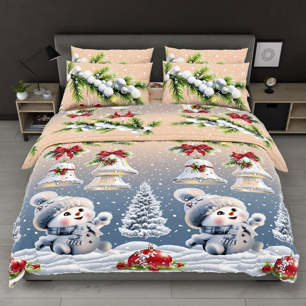 Комплект постільної білизни Королева Ночі Бязь 175х215 Двоспальний Сніговики з дзвонами та ялинками 0447-2