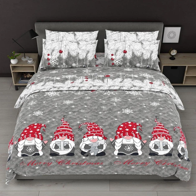 Комплект постільної білизни Королева Ночі Бязь 175х215 Двоспальний Новорічні гноми на сірому 0462-2
