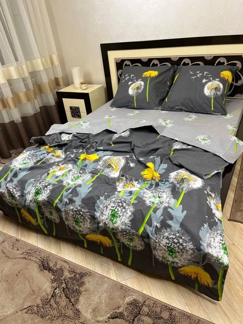 Постільна білизна бавовняна Кульбабки Півтораспальна 150 x 220 Бязь Сіра з жовтим 70 х 70