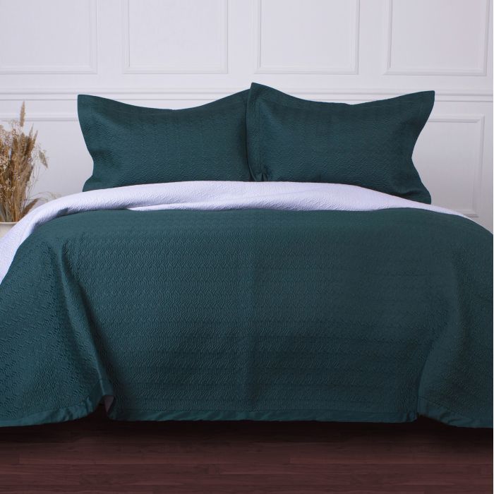 тиснення, Розміри виробу, см - 180 х 210 см, Сезон - літо, зима, весна, осінь, Склад матеріалу - 100% бавовна, наволочки: 50х70 см - 2 шт., з наволочками, домашнє прання за температури до 40 градусів, делікатний режим, мінімальна кількість обертів під час віджимання.Хімічна чистка., Колір - зелений