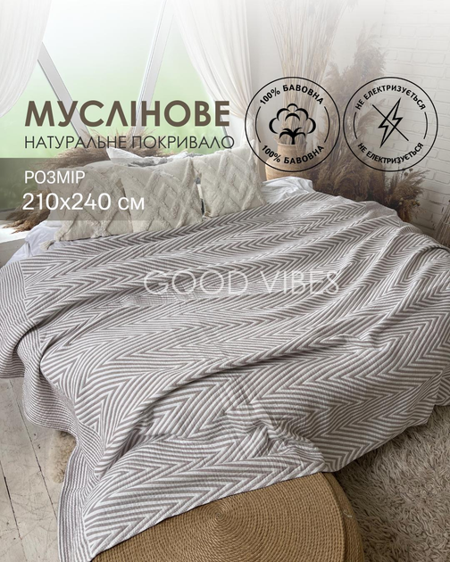 Муслінове покривало плед бавовняне візерунок зигзаг кольору капучино євро розмір 210х240 см (MAL0011)